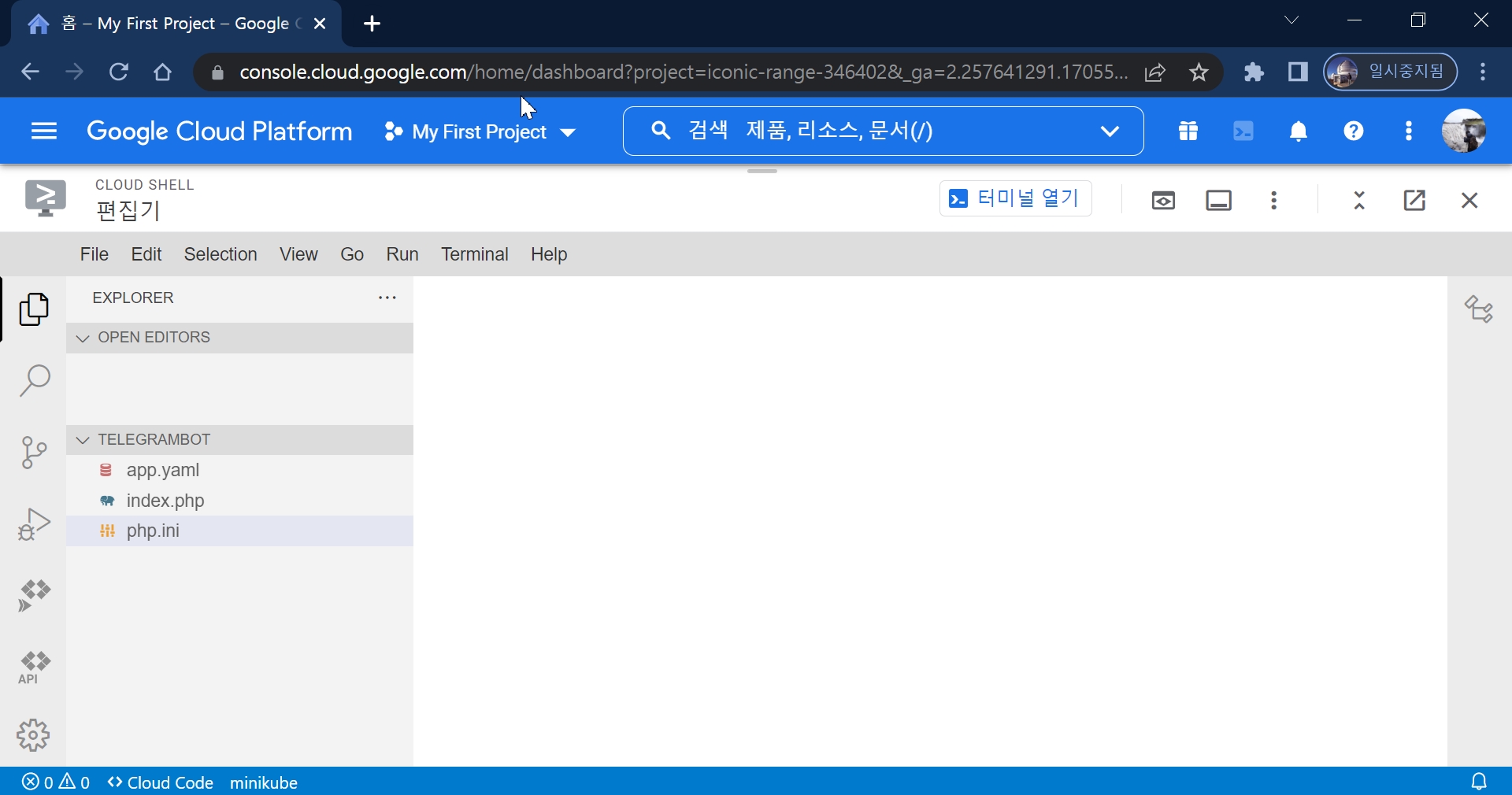 - 콘솔 홈 화면에서 오른쪽 위 터미널 모양 아이콘 눌러서 Cloud Shell 활성화 -> 편집기 열기